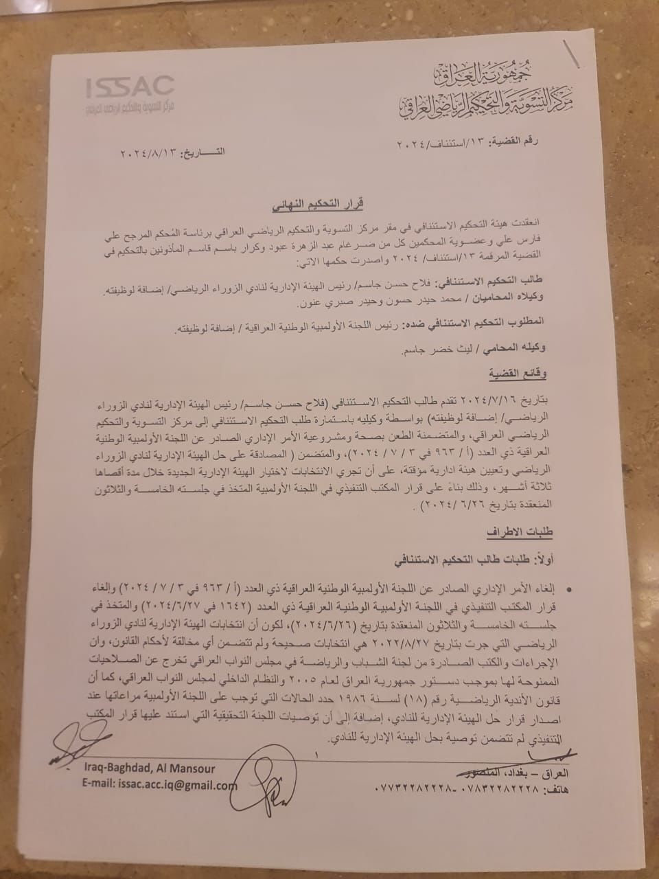 اصدر مركز التسوية و التحيكم العراقي حكما قضائيا ببطلان قرار اللجنة الاولمبية الوطنية بحل ادارة نادي الزوراء بداعي خلل في الانتخابات و تعيين هيئة ادارية مؤقته جديده لحين اجراء الانتخابات و ياتي هذا الحكم بعد تقديم ادارة فلاح حسن طعنا ضد قرار الاولمبية.